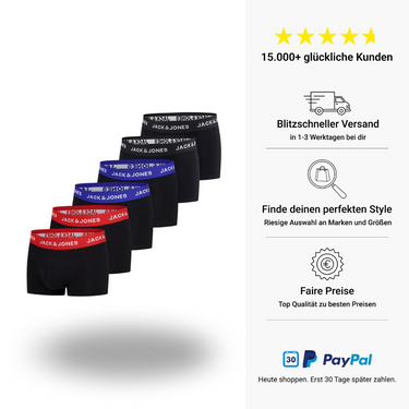 Jack & Jones Männer Basic Boxer 6er Pack mit einem angenehmen Tragegefühl durch den hohen Baumwollanteil. Der elastische Taillenbund sorgt für maximalen Tragekomfort und auch der Beinausschnitt ist so konzipiert, dass dieser in keiner Weise einschneidet. Es wurde bewusst auf störende Etiketten verzichtet, die Marken- und Pflegehinweise sind innenseitig eingeprägt. Als besonderer Eyecatcher dient der farbige Bund am Hosenbund und die farbigen Nähte.